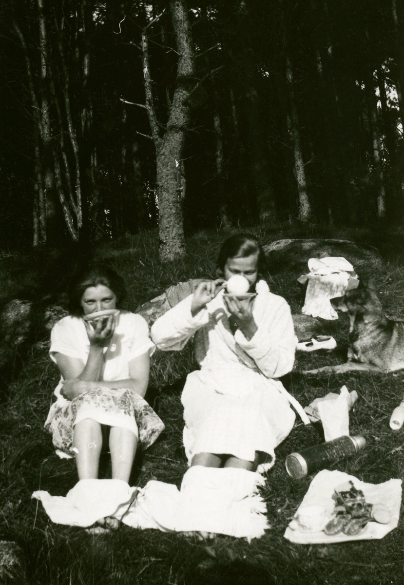 Systrarna Astrid (1907 - 1994, gift Jägerström) och Ingeborg Gustafsson (1901 - 1987, gift Johansson) sitter och fikar på tomten, Kållered Stom "Nygård", okänt årtal.