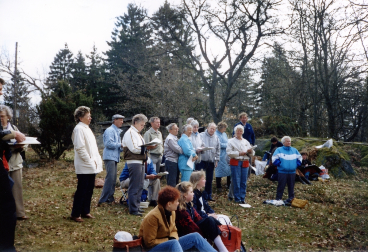 Manusläsning inför sommarens första Bygdespel "Brandskatten", Ekansås i Kållered år 1987. Män och kvinnor deltar. Relaterade motiv: A3186 - A3251.