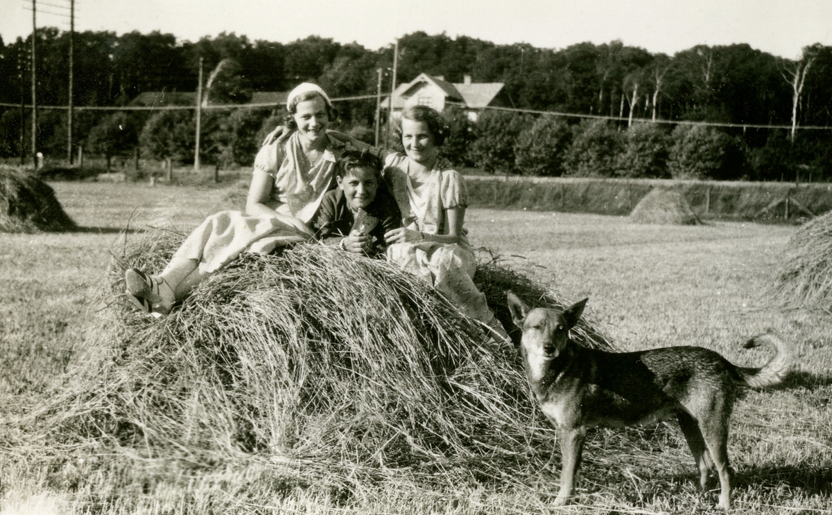 Tre ungdomar (namnuppgifter saknas) ligger på en höstack och snett framför dem står en hund, okänt årtal. I bakgrunden bakom järnvägen och Gamla Riksvägen ses Kållered Stom "Nygård" som revs 1970.