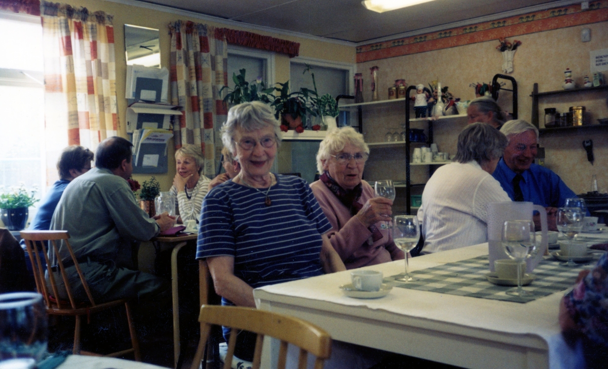 PRO Kållered är på utflykt till Önnered i Västra Frölunda år 2004. Från vänster ses Maj-Britt Larsson (i randig tröja) och Inga Andersson sittandes vid ett dukat bord.