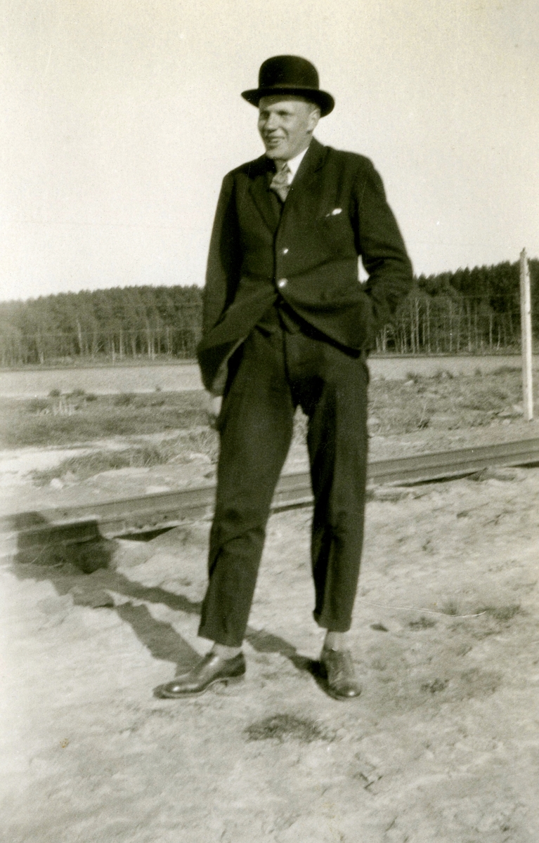 En okänd ung man, uppklädd i kostym och hatt, är på besök vid omläggningen av Västkustbanan, Sagsjön slutet av 1920-talet.