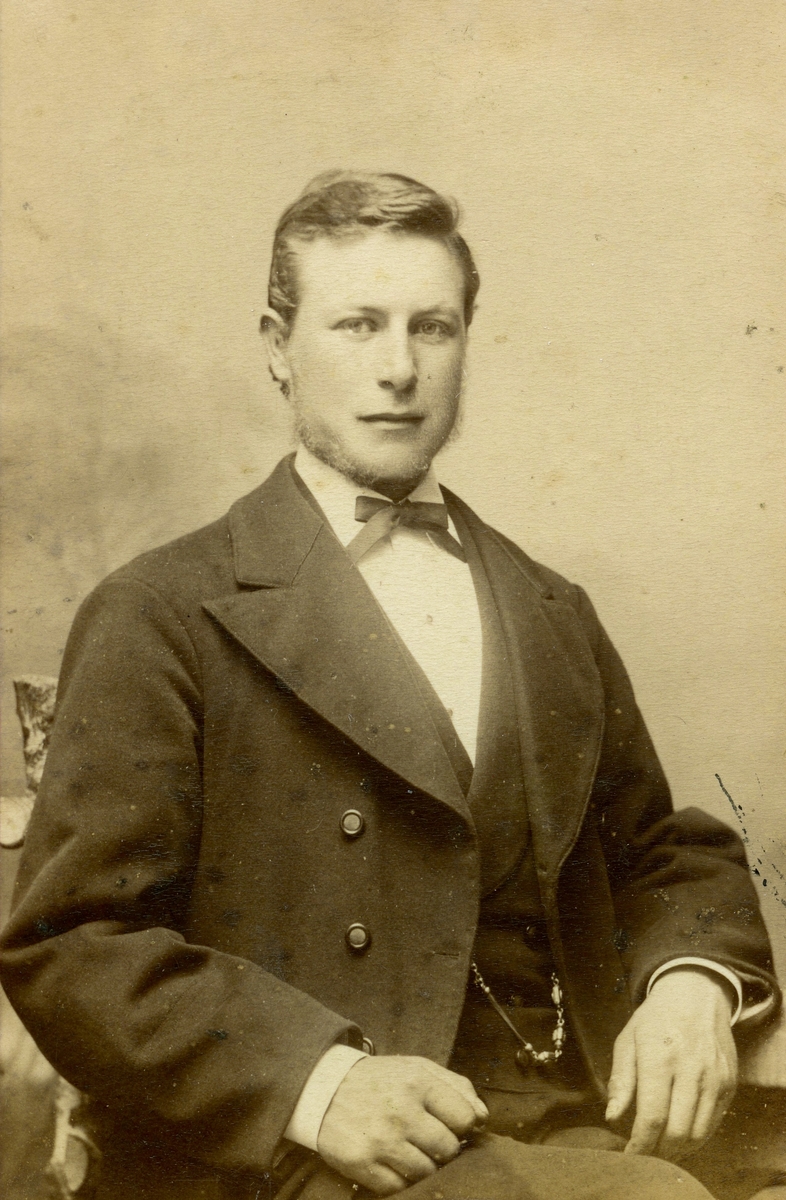 Ateljéporträtt av Karl Andersson (född 1858 i Livered, död 1931 i Livered) cirka 1880. Gift med Emma Andersdotter (född 1854 i Landvetter, död 1931 i Livered).