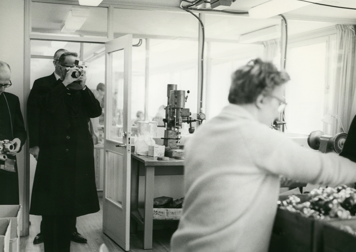 Biskop Bo Giertz besöker den daliga verksamheten på Stretereds vårdhem och skola i samband med Biskopsvisitationen år 1966. En man fotograferar en person i arbete.