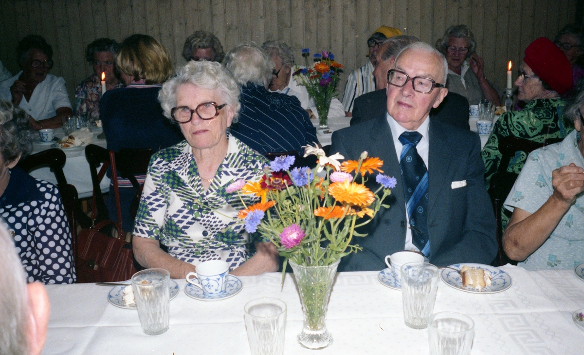 Hobbyverksamhet för pensionärer, 1970-tal. Utflykt till Resa Två Skyttlar, hotell och restaurang i Örby. Okända kvinna och man som sitter till bords.