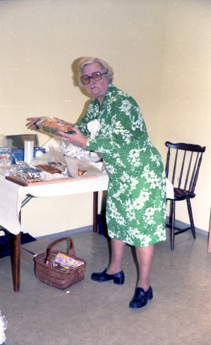 Julförsäljning av hantverk i pensionärernas hobbylokal på Våmmedalsvägen år 1977. Berta Mattsson (1910 - 2013) står vid ett bord.