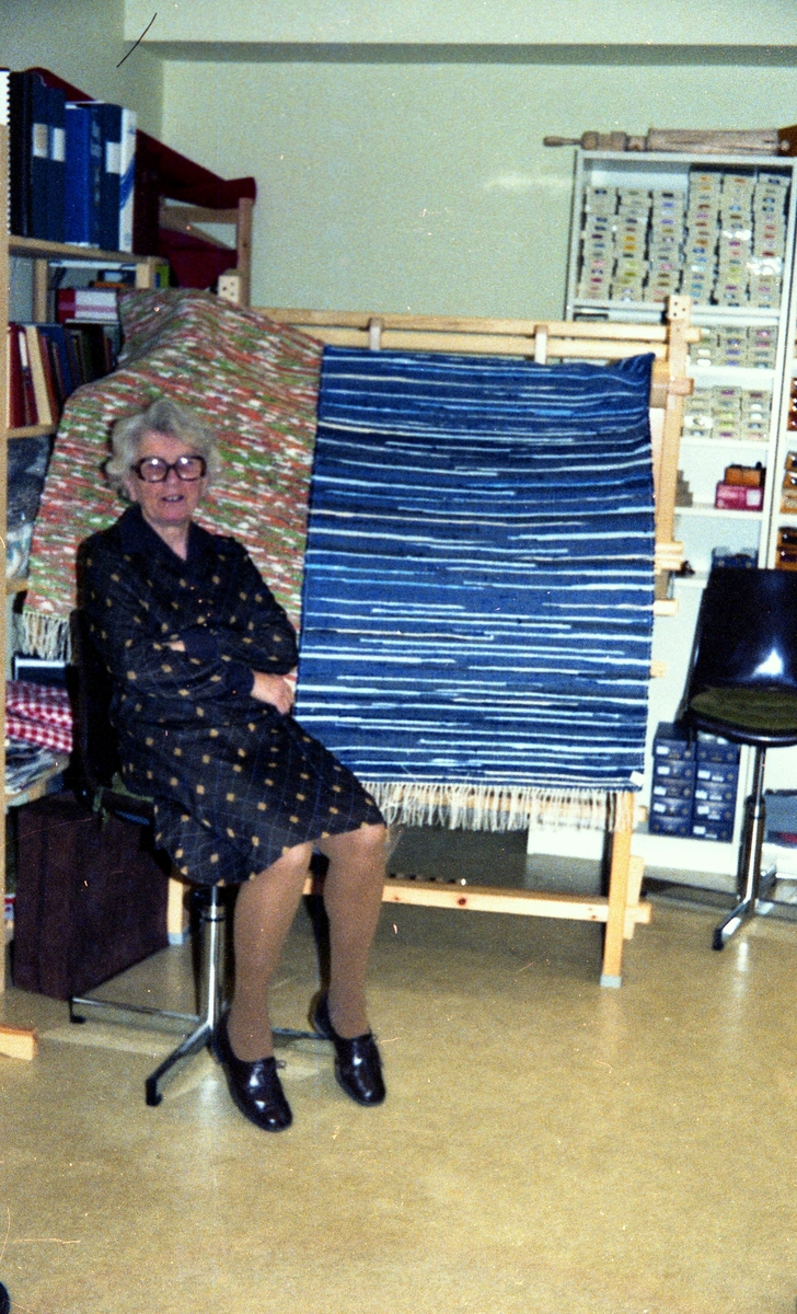 Julförsäljning av hantverk i pensionärernas hobbylokal på Våmmedalsvägen år 1977. En kvinnar sitter brevid en vävstol där det hänger två handvävda mattor.