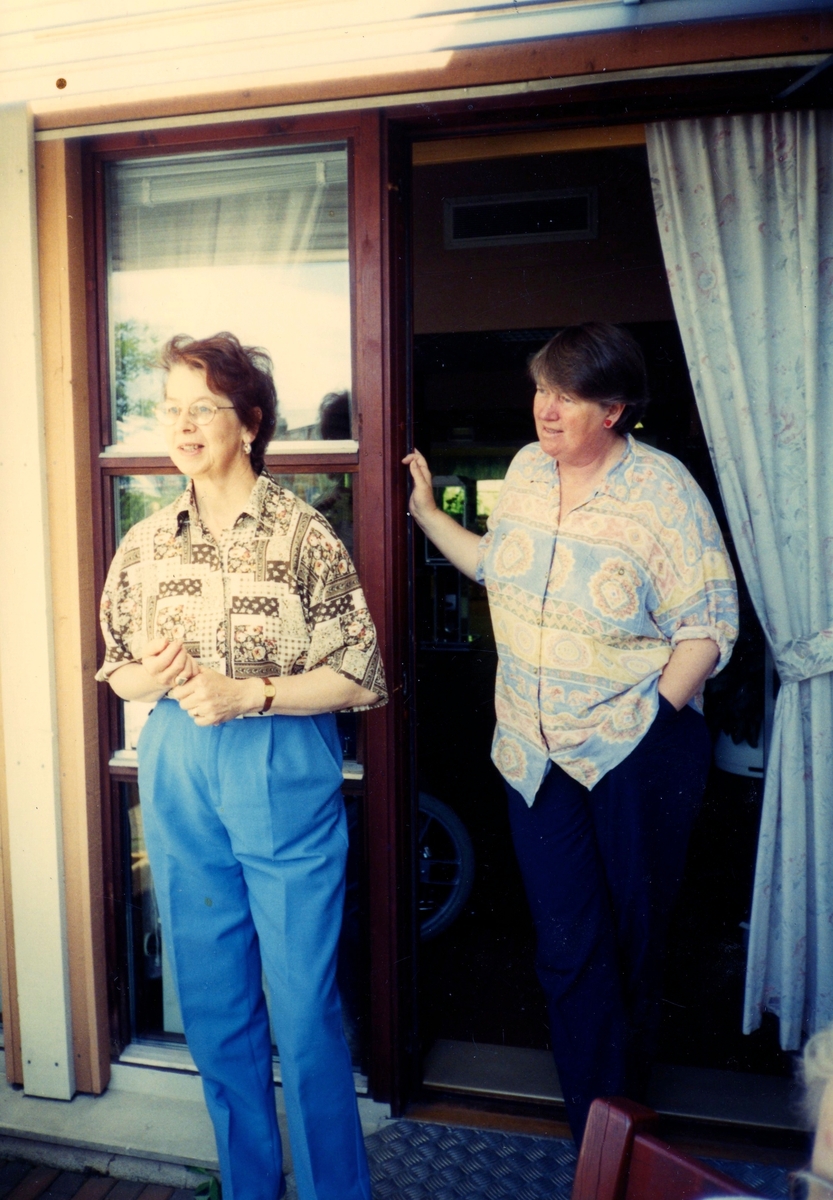 Utanför Brattåsgården (på Streteredsvägen) cirka 1990. Från vänster: vårdbiträdena Agneta (efternamn saknas) och Monica Carlsson tar lite luft.