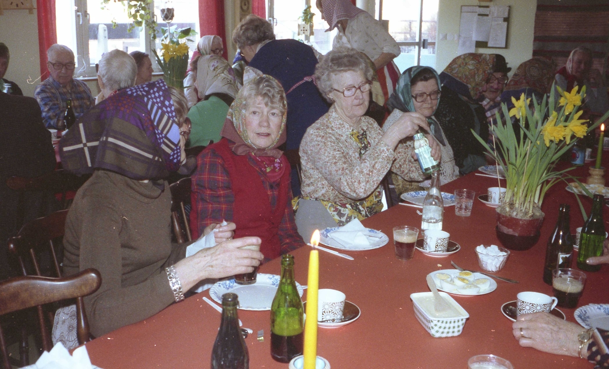 Påsklunch i Brattåsgårdens hobbylokal på Vommedalsvägen år 1979. På bordet står en påsklilja. Namnuppgifter saknas.