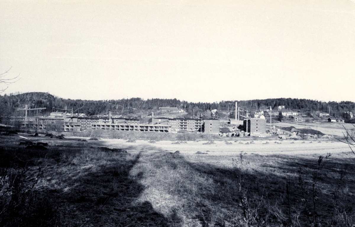 Vy norrut mot nybyggnationen av Vommedals hyresrättsområde (Vommedalsvägen) cirka 1969 - 1970. I fonden till vänster ligger Brattåsskolan och i mitten ses gårdarna vid Olas väg.
