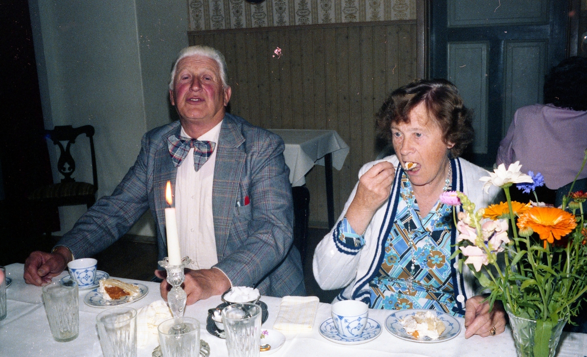 Hobbyverksamhet för pensionärer, 1970-tal. Utflykt till Resa Två Skyttlar, hotell och restaurang i Örby. En man (kostymklädd med fluga) och en kvinna som sitter till bords.