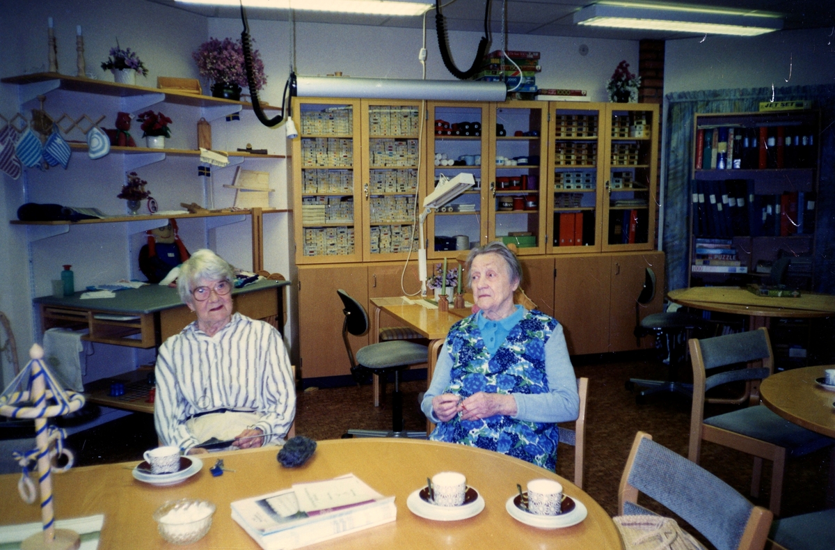Edit Bernhardsson (1911 - 2000, Torrekulla) och Ida Bengtsson (1900 - 1995, Tulebo) sitter och fikar i Brattåsgårdens terapilokal på Streteredsvägen 5, okänt årtal.