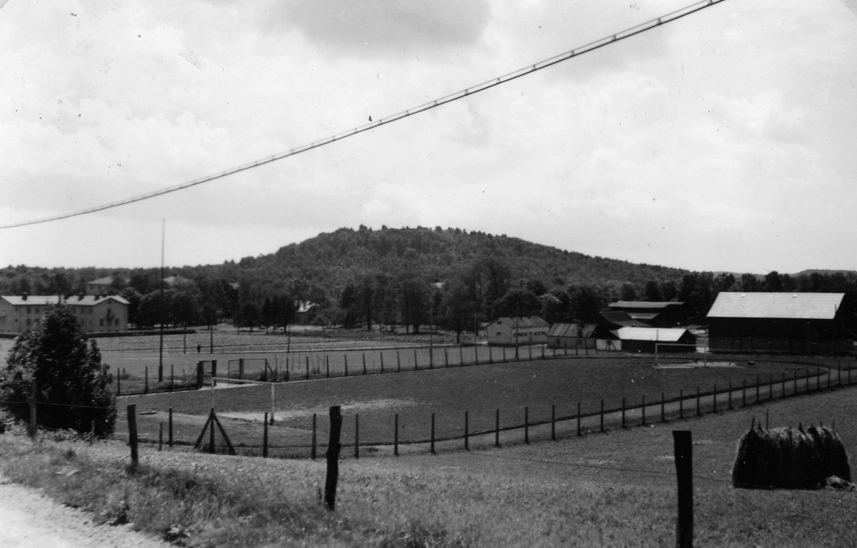 Till vänster ligger Lilla Skolan och till höger ladugårdsbyggnaderna i Stretered, år 1947. I mitten ligger idag KSKs idrottsplaner.