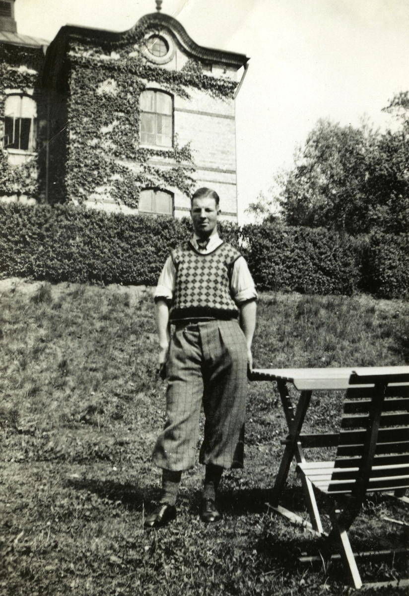 Gustav Berglund står finklädd framför Stora skolan i Stretered, 1930-tal. Han var elev på Stretereds skolhem.