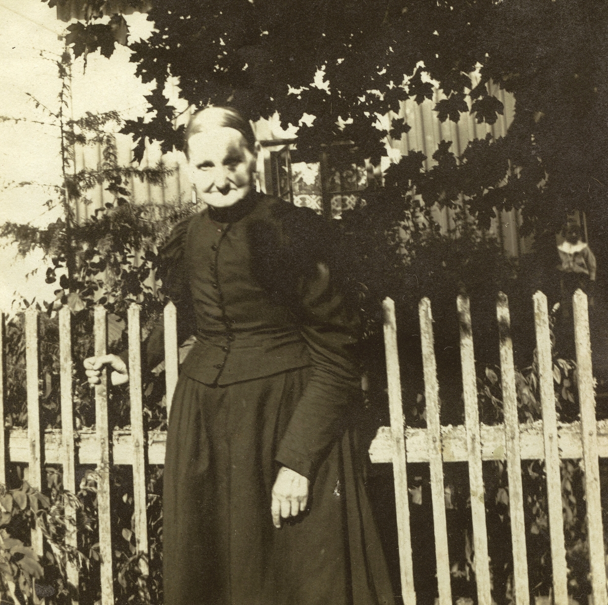 Emma Andersdotter Andersson (född 1854 i Landvetter, död 1931 i Livered) står vid ett staket, Livered 1:15 "Majas", okänt årtal. Gift med Karl Andersson, Livered "Majas" (nu: Streteredsvägen 36).