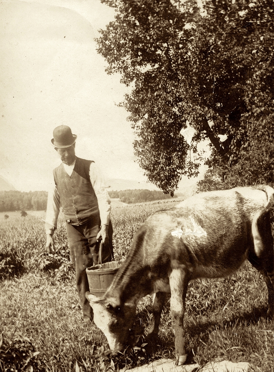 Karl Andersson (född 1858 i Livered "Majas", död 1931 i Livered "Majas") håller en hink ståendes vid en ko, cirka 1915 - 1920.