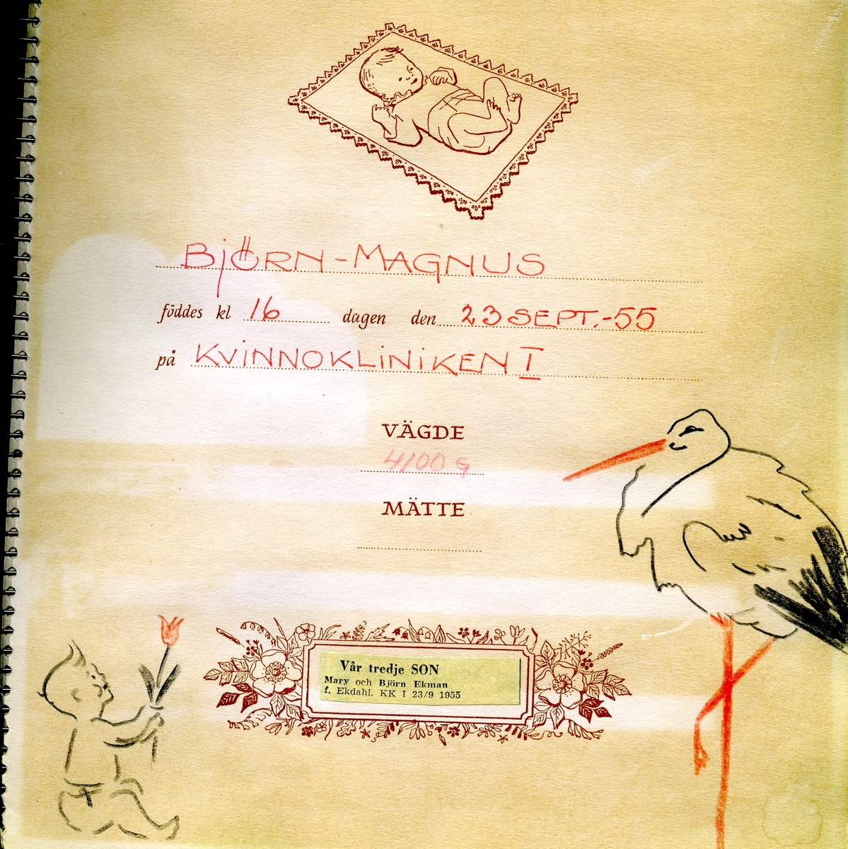 Födelseanteckning samt tidningsannons för Björn-Magnus "Manne" Ekman född i Göteborg 1955.