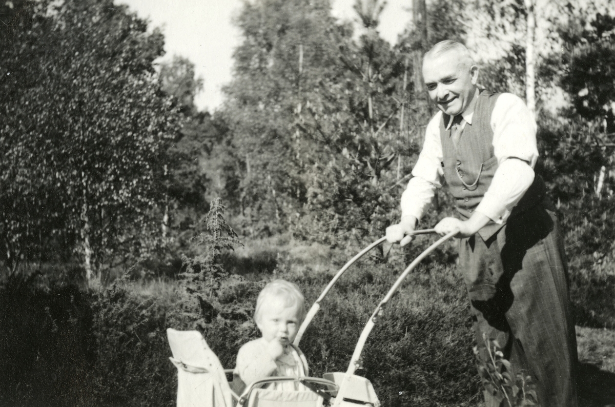 Carl Krantz (1880 - 1956) är på promenad med dotterdottern Eva Pettersson (född 1944, gift Kempe) som sitter i kärra, Stretered år 1945. Carl Krantz var skomakare och undervisade vid Stretereds skolhem.