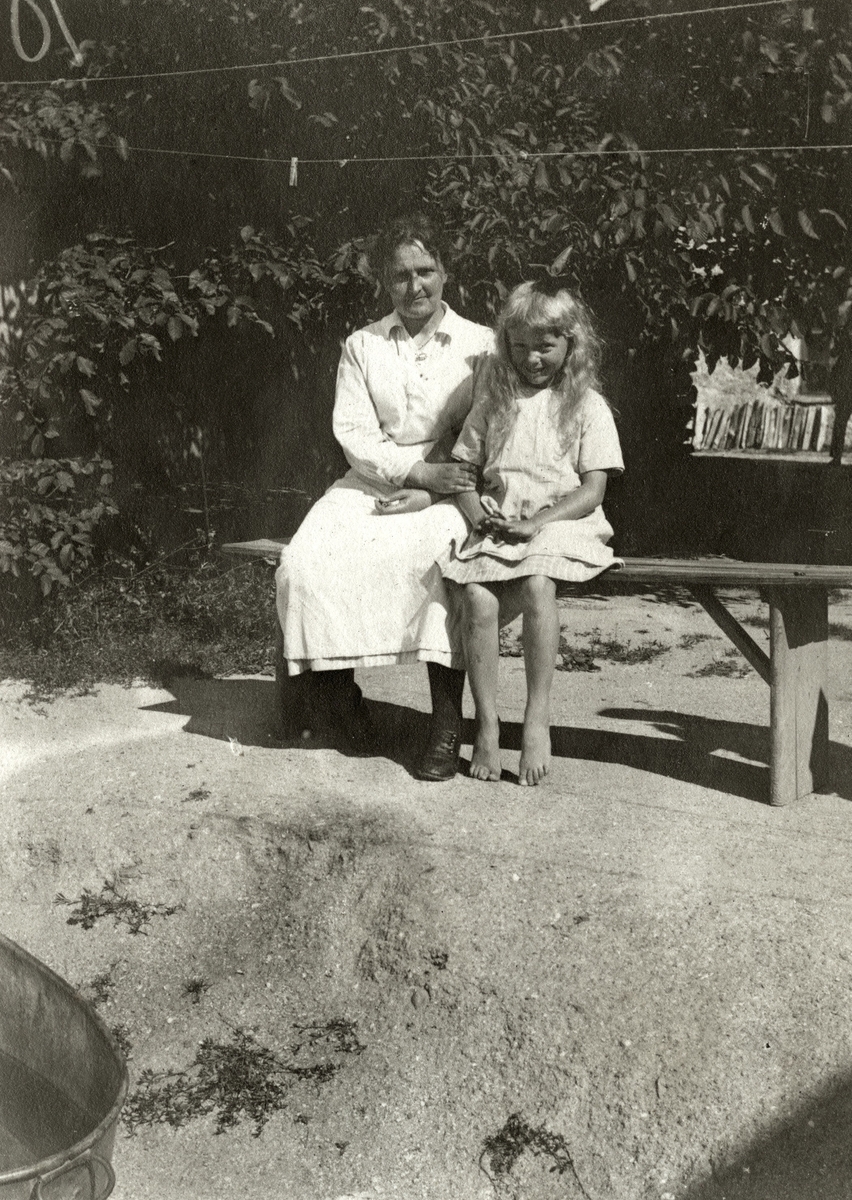 Nora Krantz (1879 - 1955) och dottern Rosa (1912 - 1994, gift Pettersson) sitter på en bänk utanför Stretered, cirka 1921 - 1923. Nora arbetade på Stretereds vårdhem, därav klädseln.