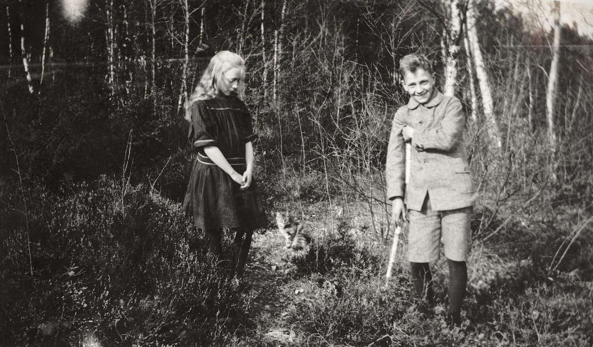 Syskonen Rosa (1912 - 1994) och Östen Kranz (1910 - 1990) står i en trädgård, Stretered år 1923. De var barn till Nora och Carl Kranz, båda anställda på Stretered.