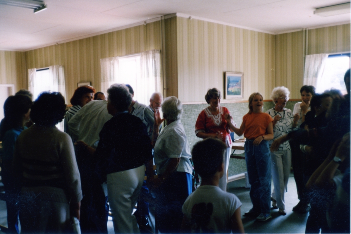 Dansövning/repetition inför Bygdespelet "Brandskatten", A-salen i Kållereds Kommunalhus (Streteredsvägen 3) 1986/87.