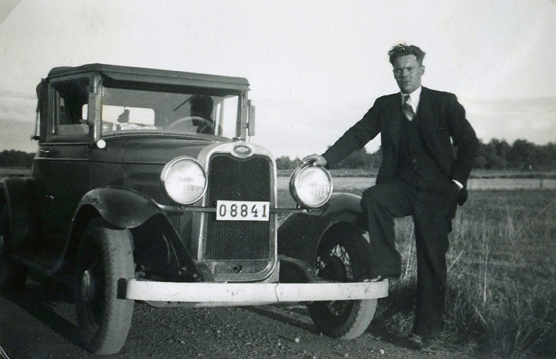 Gustav Jinfäldt (1910 - 1982) med sin Opel Regent, Hallen 1930-tal. Han var son till Johan och Augusta Karlsson, Hallen 1:4.