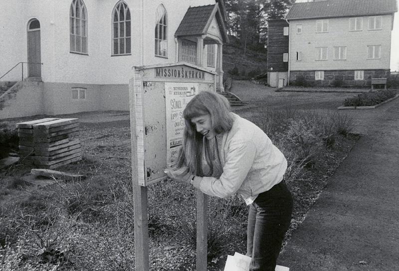 En ung kvinna lutar sig framåt och skrattar, okänt årtal. Hon står framför en skylt tillhörande Kållereds missionsförsamling. Till vänster ses Kållereds Missionskyrkan (senare Ekenkyrkan) och i bakgrunden till höger ses Villa Fridhem.