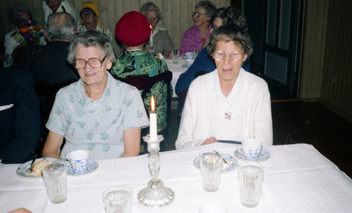 Hobbyverksamhet för pensionärer, 1970-tal. Utflykt till Resa Två Skyttlar, hotell och restaurang i Örby. Från vänster: Okänd dam samt Valborg Smitt (1901 - 1986) som sitter till bords.