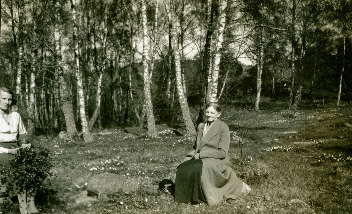 Vitsippor på tomten tillhörande Kållered Stom "Nygård" (revs 1970) som låg utefter järnvägen och Gamla Riksvägen, okänt årtal. Från vänster skymtar Ingeborg Gustavsson (1901 - 1987, gift Johansson) och modern Karolina Gustavsson (1873 - 1949).