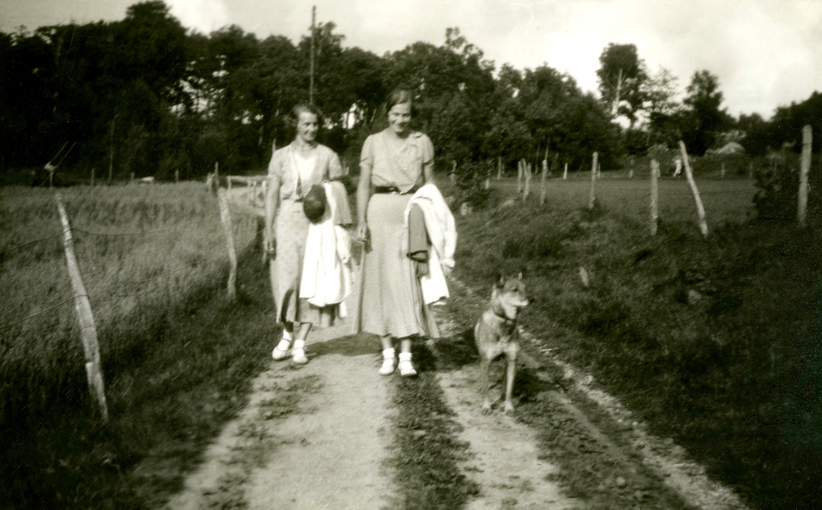 Systrarna Astrid (1907 - 1994, gift Jägerström, Råda) och Ingeborg Gustafsson (1901 - 1987, gift Johansson) promenerar på en landsväg tillsammans med en hund i koppel, Kållered Stom "Nygård" okänt årtal.