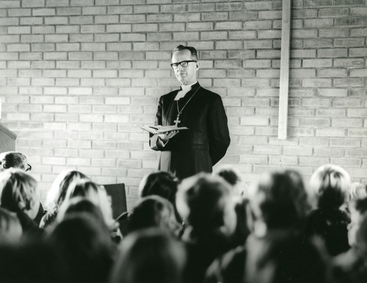 Biskop Bo Giertz står med en uppslagen bok i händerna framför skoleleverna i Församlingshemmet vid Biskopsvisitationen år 1966.