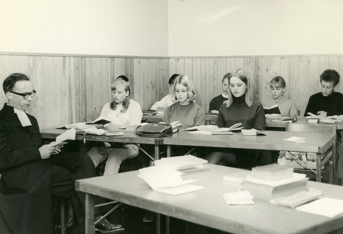 Titel: Komminister Gustaf Lindman har konfirmationsundervisning med elever (födda 1952) i Kållereds församlingshems källarlokal år 1966.