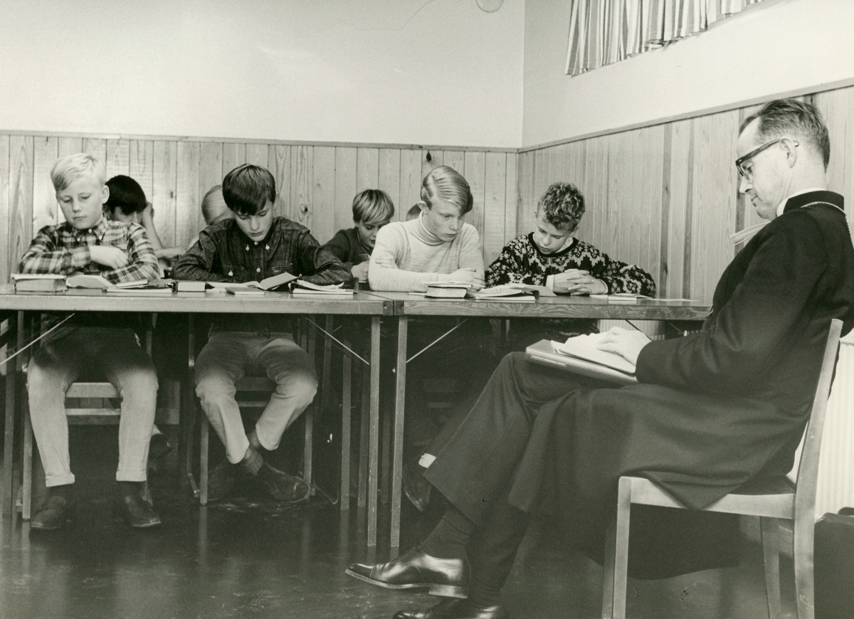 Biskop Bo Giertz är på besök i samband med Biskopsvisitationen och deltar i konfirmationsundervisning med elever (födda 1952) i Kållereds församlingshems källarlokal år 1966.