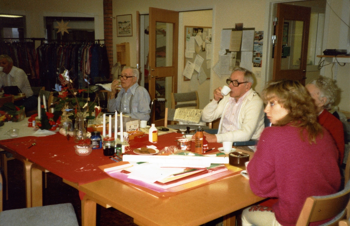 Fikastund i Brattåsgårdens hobbylokal (Streteredsvägen 5), 1990-tal. Sittandes från vänster: 1. Einar, 2. Knut Jerkfelt, 3. skymd, samt 4. kvinnlig vårdbiträde.