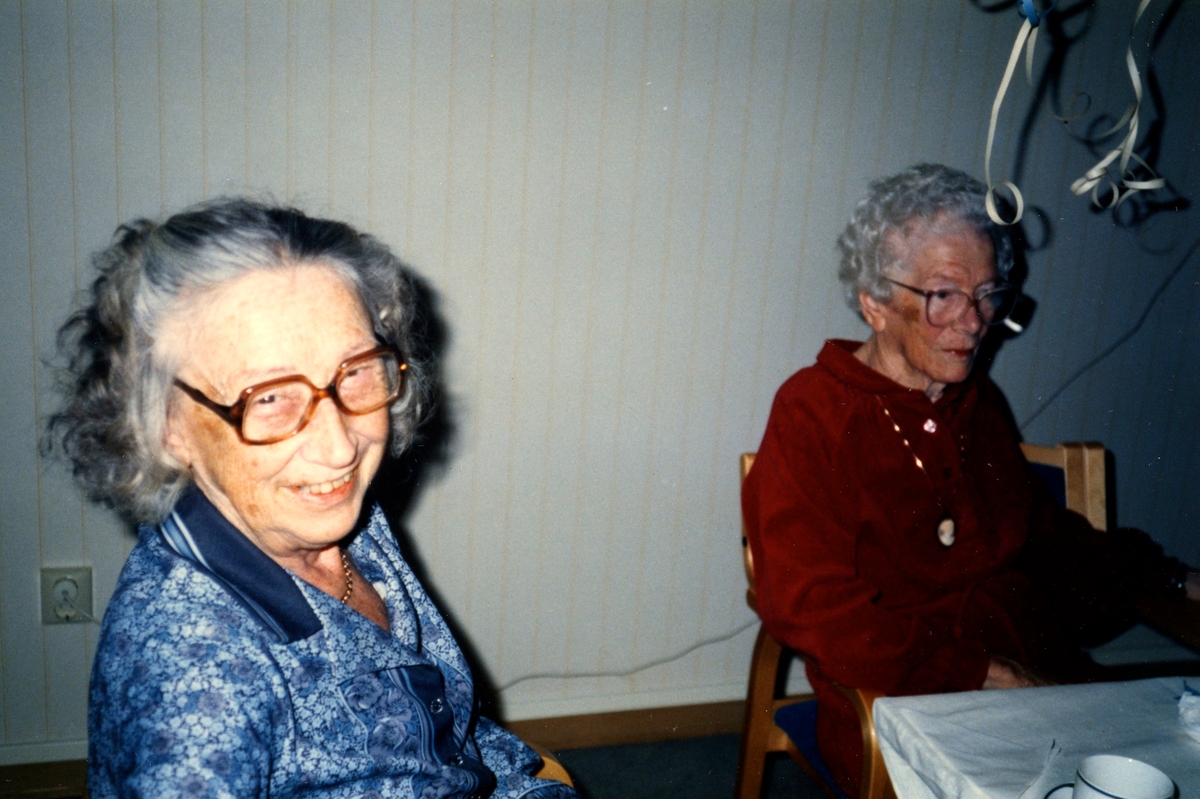 Marianne Skarin och Helfrid Kristensson sitter och fikar i Brattåsgårdens matsal på Streteredsvägen 5, cirka 1990. En girlang hänger från taket.