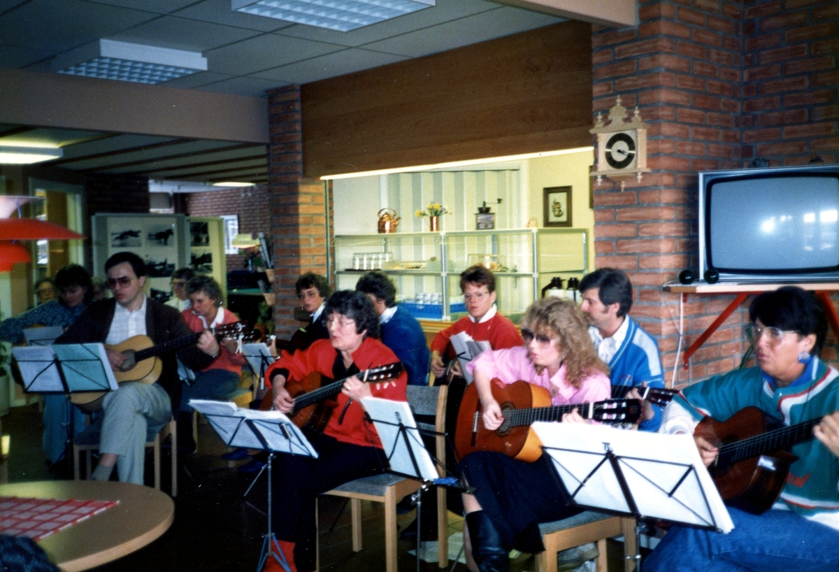 Musikskolan är på besök och spelar gitarr i Brattåsgårdens matsal på Streteredsvägen 5, cirka 1990. Musikerna består av en grupp på 11 personer.