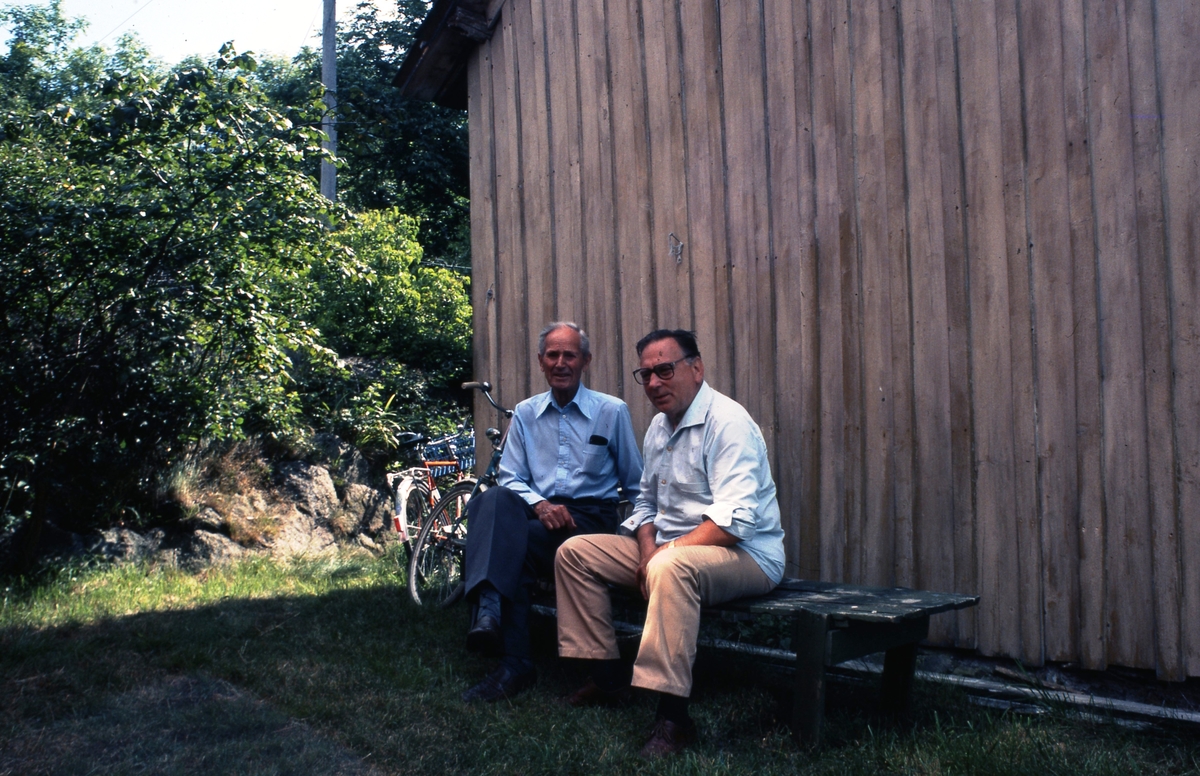 Gustaf Carlsson (1905 - 1988) och Thure Bjerrhede (1918 - 2004) sitter på en bänk utanför Långåker 1:2, cirka 1980. Grannhuset till Hembygdsgården Långåker 1:3.