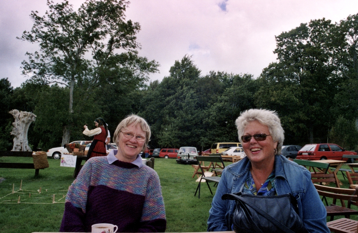 Kristina Karlsson och Lotta Lind fikar utanför Hembygdsgården Långåker 1:3, 2000-tal.