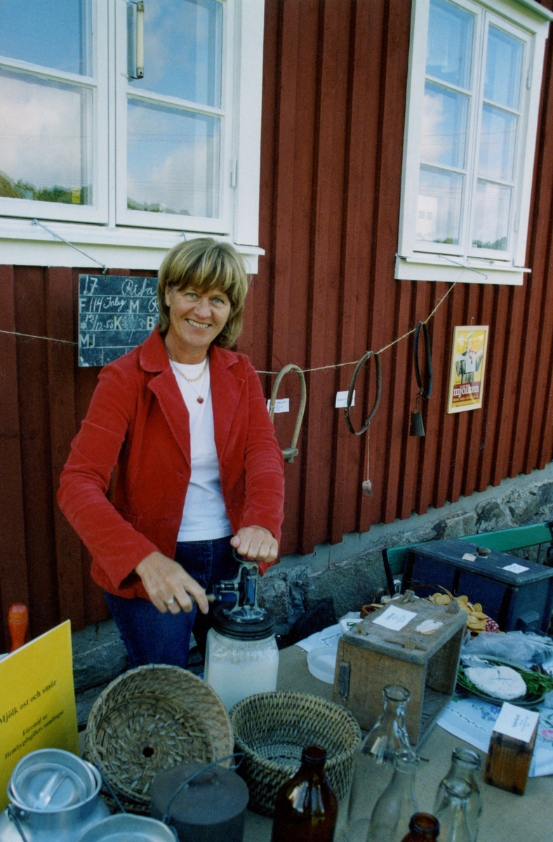 Gun Paterson visar mjölkredskap under en hembygdsdag i augusti utanför Hembygdsgården Långåker 1:3, 2000-tal.