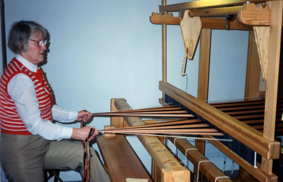 Emy Johansson arbetar hemma i sitt kök med väven till Kållereds Hembygdsdräkts sjal, Torrekulla 1980-tal. Relaterade motiv: A2911-A2917.