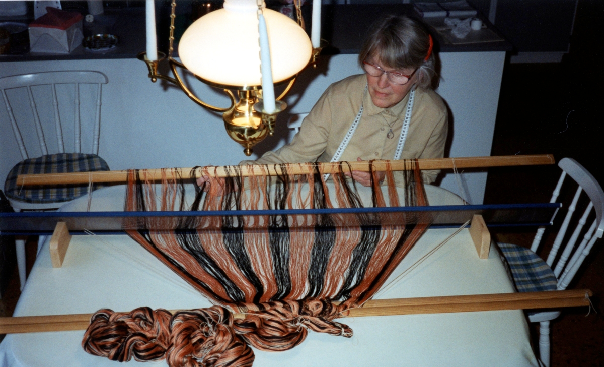 Emy Johansson arbetar hemma i sitt kök med väven till Kållereds Hembygdsdräkts sjal, Torrekulla 1980-tal. Relaterade motiv: A2911-A2917.