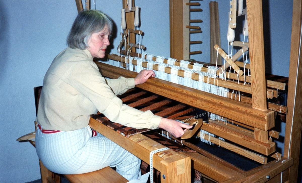Emy Johansson arbetar hemma i sitt kök med väven till Kållereds Hembygdsdräkts sjal, Torrekulla 1980-tal. Relaterade motiv: Relaterade motiv: A2911-A2917.