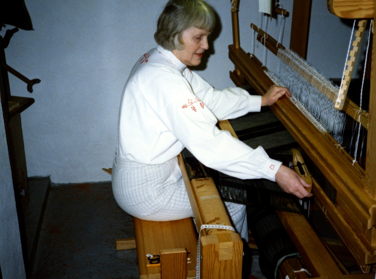 Emy Johansson arbetar hemma i sitt kök med väven till Kållereds Hembygdsdräkts sjal, Torrekulla 1980-tal. Relaterade motiv: A2911-A2917.