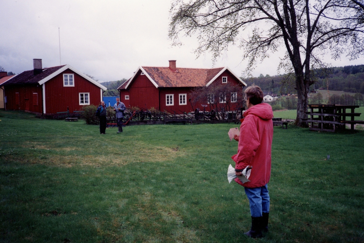 Karin Gustafsson (i röd jacka, bortvänd från kameran) tittar mot en okänd man samt maken Berny Gustafsson som står vid Hembygdsgården Långåker, okänt årtal.