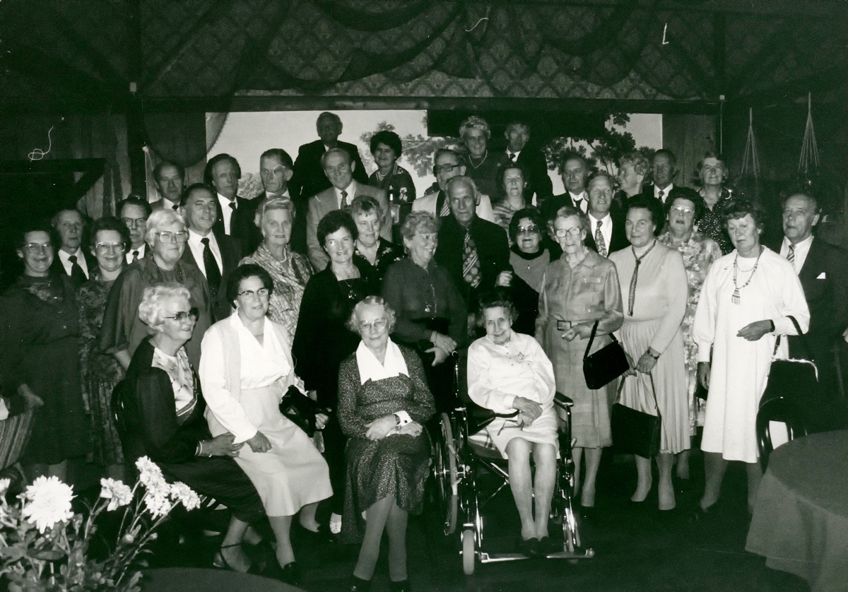 Skolträff för elever födda 1918, 1919 och 1920, Kållereds värdshus på Gamla Riksvägen 44, okänt årtal. Lärare: Greta Alm Andersson, Margareta "Greta" Hernqvist och Jessie Thölén.