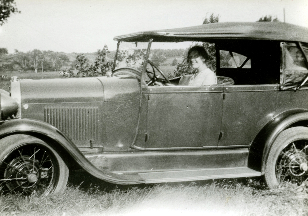 Ingrid Larsson (1910 - 1985) sitter på förarplats i en bil, okänd ort, cirka 1930 - 1935. Ingrid hade släkt i Kållered och var gift med Wilhelm Larsson, Södermalm i Mölndal, som ägde ett åkeri i Mölndal.