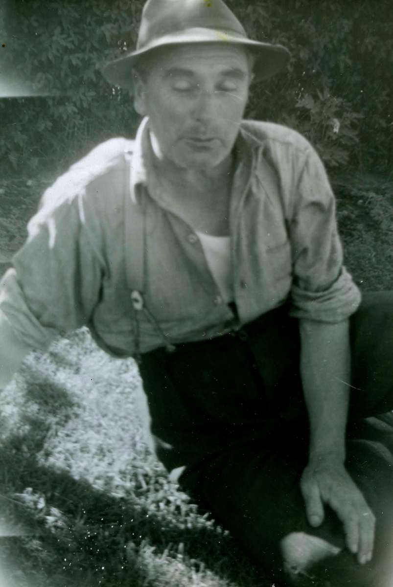 Erik Bengtsson (född i Dammkärr, Tulebo 1899 - död 1991 i Vommedal) sitter på gräsmattan och vilar, Heljered Sörgård "Skräddarns", okänt årtal. Han ägde och brukade gården tillsammans med hustrun Margit. Gården blev senare Heljereds förskola.