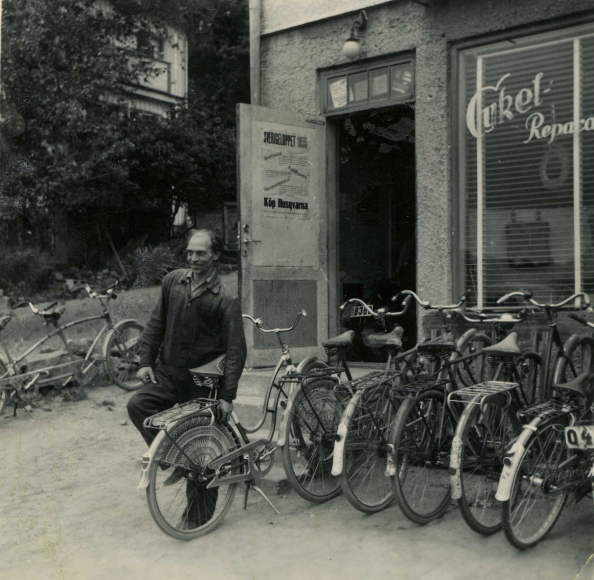 Gösta Olsson (1920 - 1989) i sin cykel- och mopedverkstad (eventuellt även radioapparater) i sin lokal "Solbacken" Vommedal Västergård 3:44 på Gamla Riksvägen 47, okänt årtal. Han arbetade också som tekniker (maskinist) i Waldts Plåtfabrik.