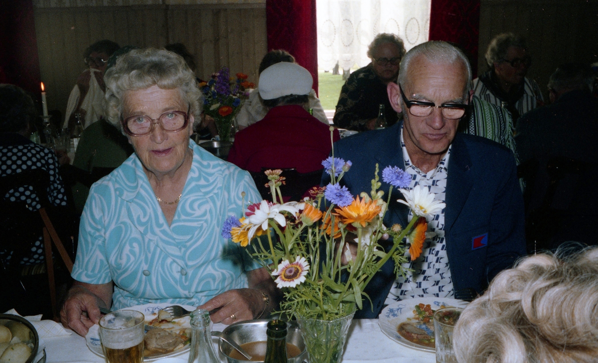 Hobbyverksamhet för pensionärer, 1970-tal. Utflykt till Resa Två Skyttlar, hotell och restaurang i Örby. Från vänster: Hulda Olsson och Valfrid "Valle" Svensson (1908 - 1991) som sitter till bords.