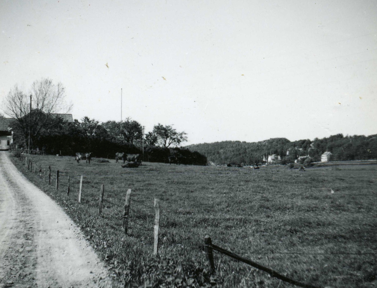 Vy norrut mot Ekans gård år 1953. Här går Ekenleden idag. Där gården låg byggdes varuhuset IKEA under 1970-talet.