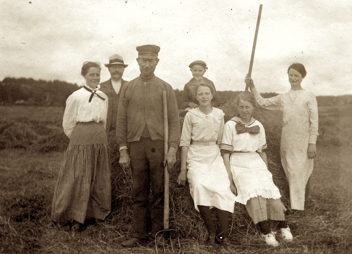 Sommargäster och boende står på åkern vid Livered "Majas" 1:15 (idag: Streteredsvägen 36), okänt årtal. Från vänster: 1. Sommargäst. 2. Sommargäst. 3. (troligtvis) Karl Andersson. 4. Okänd pojke. 5. Okänd kvinna. 6. Okänd kvinna. 7. Karin Andersson (Karls dotter).